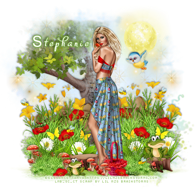 Resize element 88 to 20%, paste on the stump on the right below the small grass layer, duplicate, resize smaller to 75%, move to the left on the grass.