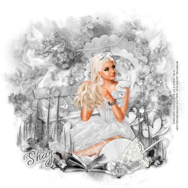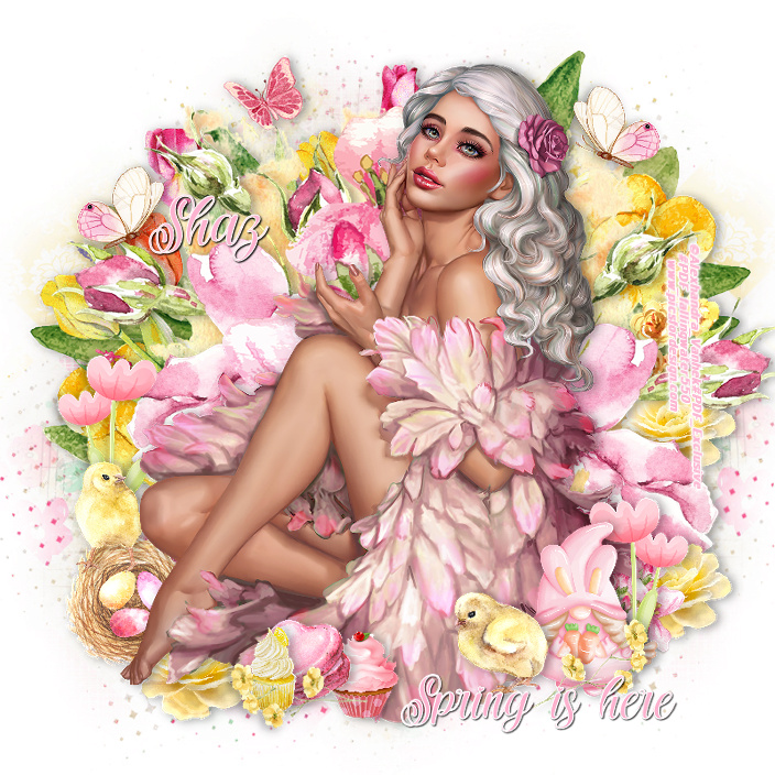Resize element 79 to 20%, paste below the flower by her foot, duplicate, move