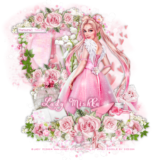 Resize your tube to 40%, paste above the flowers on the frame to the right.