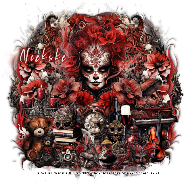 Resize element 34 to 75%, paste above the mask on the left, duplicate, mirror,