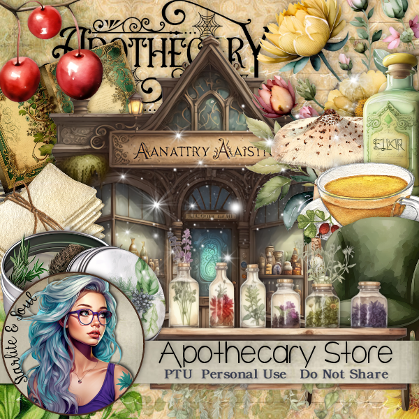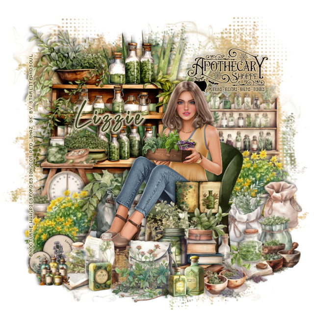 Resize element 139 to 15%, paste at the bottom left behind the little bottles.