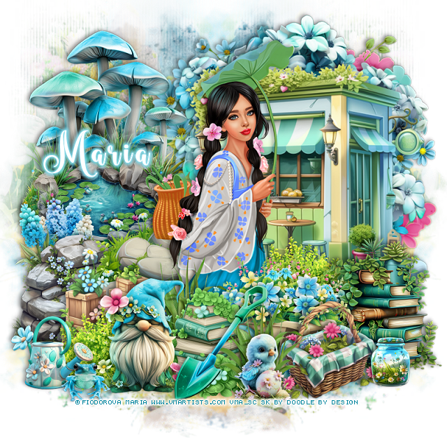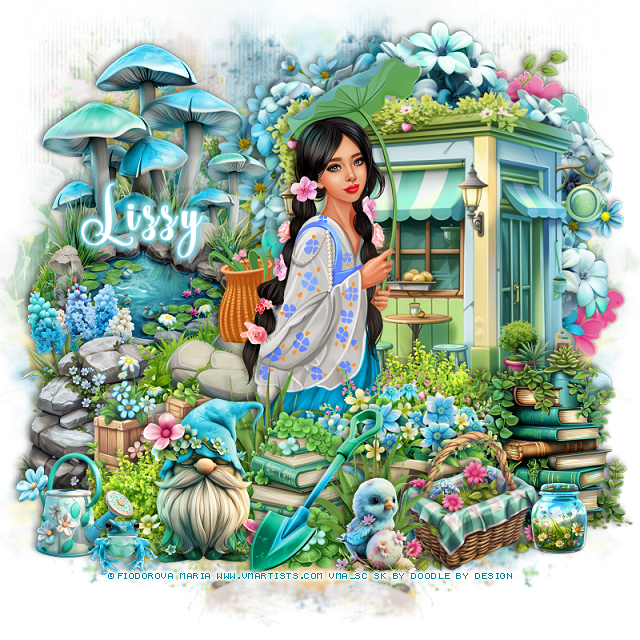 Resize element 35 to 20%, paste at the bottom by the flower cart.