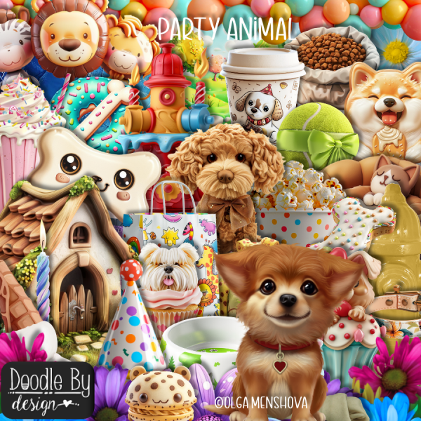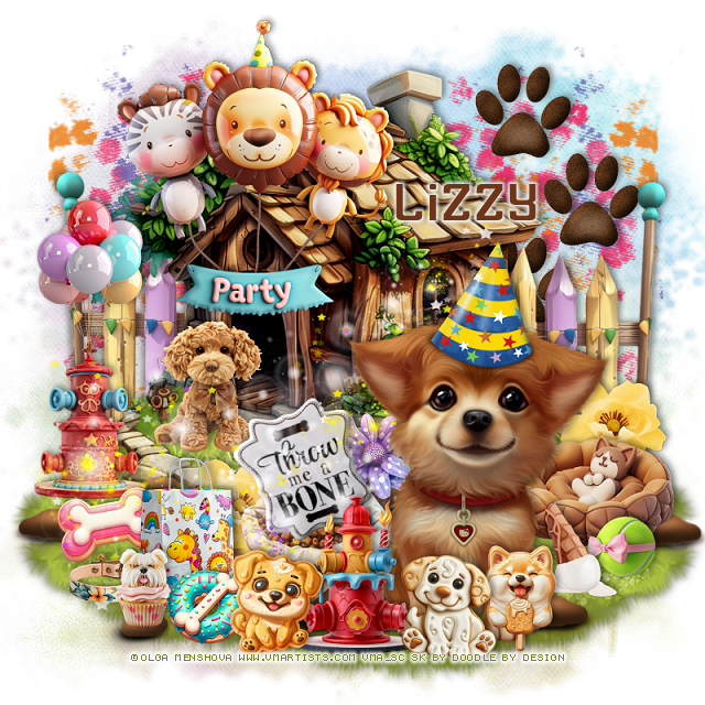 Resize element 24 to 55%, paste below the party sign on the dog house.